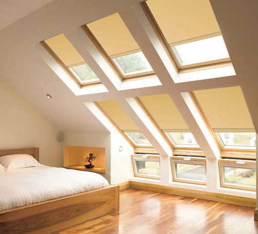 Velux Energy Blinds: Honeycomb-style pleated blinds with aluminium coating inside for improved insulation. Reduces heat loss in winter and solar gain in summer.